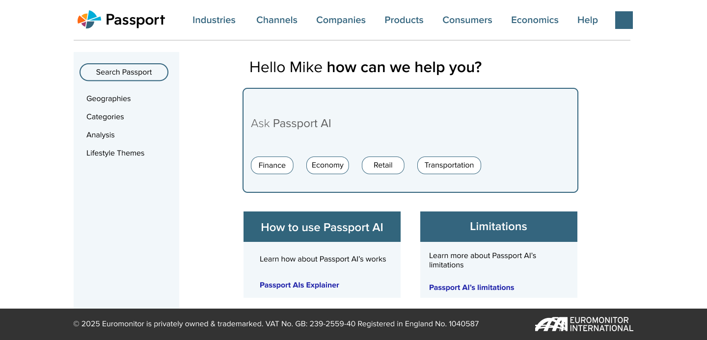 Euromonitor is considering delivering an AI Assistant for its customers. The primary function of this agent will be to assist customers to find the data they are looking for & results and reports will be created using Euromonitor’s data and written insights.